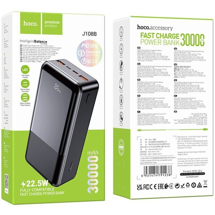 پاور بانک فست شارژ هوکو 22.5 وات مدل J108B با ظرفیت 30000 میلی آمپر ساعت