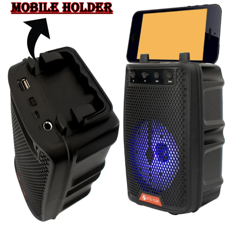 کی تی اس 1338 یک اسپیکر بلوتوثی جذاب همراه با رقص نور با قدرت پرتاب صدای 4 اینچی با بیس مناسب است. این اسپیکر با دارا بودن محل قرار گیری دست جهت حمل و همچنین سطح نگهدارنده تلفن های همراه آن را به یک دستیار صوتی کوچک اما پرکاربرد برای استفاده های روزمره تلقی میگردد.